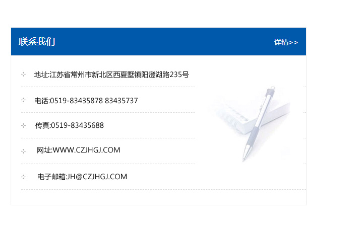 地址:常州市新北區友邦商務大廈1幢16、17層  電話:0519-85101652  傳真:0519-85112595  郵編:213022  網址:www.cz-jiayue_cn.eu-superior.com  郵箱:xiajifengaa@163.com